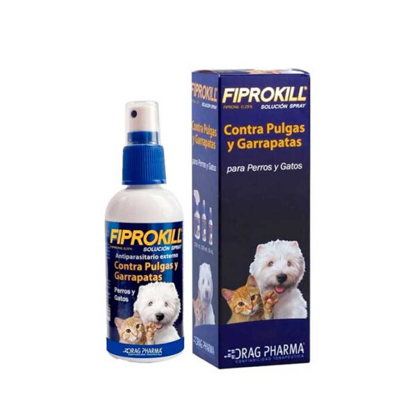 Fiprokill Solución Spray, es efectivo en el control y tratamiento de la infestación por pulgas (Ctenocephalides felis) y garrapatas (Rhipicephalus sanguineus) en perros y gatos desde los 2 dias de edad, proporcionando un rápido efecto “knock- down” contra pulgas adultas, sin necesidad de que esta requiera morder o picar al animal para que tenga el efecto deseado. La eliminación de garrapatas se inicia a las 24 o 48hrs después de la aplicación.